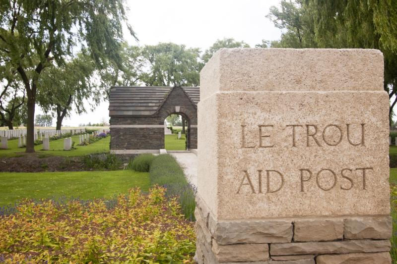 Aménagé par Sir Herbert Baker, Situé rue Pétillon, à quelques centaines de mètres du parc mémorial australien de Fromelles, le Trou Aid Post est des plus beaux cimetières du Commonwealth de la région. 356 soldats du Commonwealth y reposent à présent, dont 207 n’ont pu être identifiés.